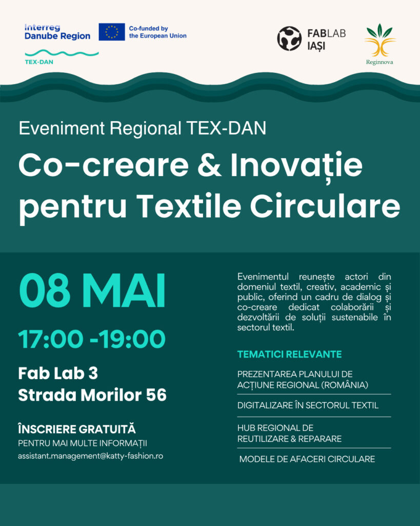 Despre Webinar Marți, 30 septembrie 2025, 16:00–17:30, ne întâlnim la Fablab 1, Iași pentru un atelier de validare a strategiei TEX-DAN. În 90 de minute, vei contribui direct la recomandările care vor ghida tranziția către circularitate, digitalizare și branduri românești mai competitive. Evenimentul va oferi și o prezentare scurtă referitoare la contextul actual și direcțiile strategice la nivel național și european, și va […]
